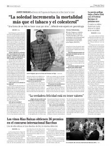 De hecho, este experto aseguró que la soledad incrementa la mortalidad más que el tabaco y el colesterol. Así lo puso de manifiesto en el Faro de Vigo, en una entrevista de Mar Mato que se puede leer, en su versión original impresa, aquí, en este enlace directo.