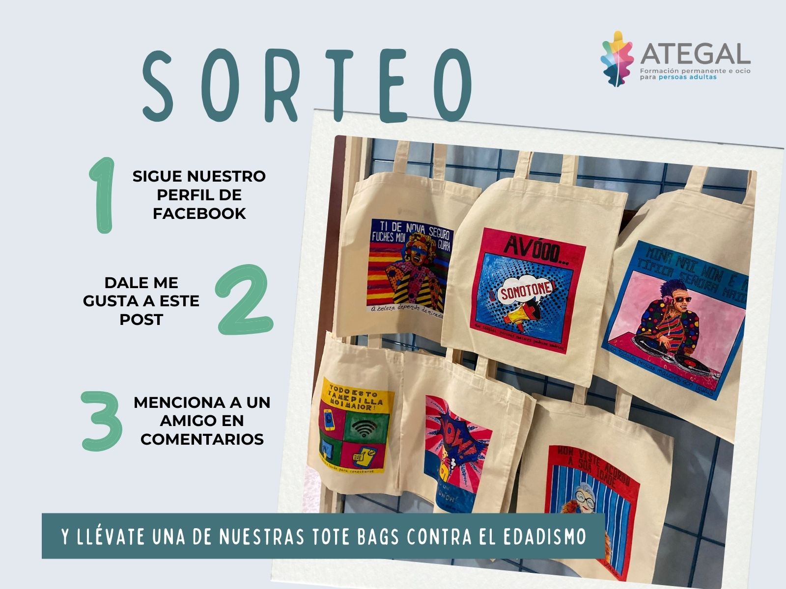Agora, con este mesmo obxectivo, puxemos en marcha un sorteo de 5 destas tote bags a través do noso perfil de Facebook. Para participar, só hai que ir a esta rede social, seguir o perfil de Ategal e comentar na publicación do sorteo mencionando a un amigo.