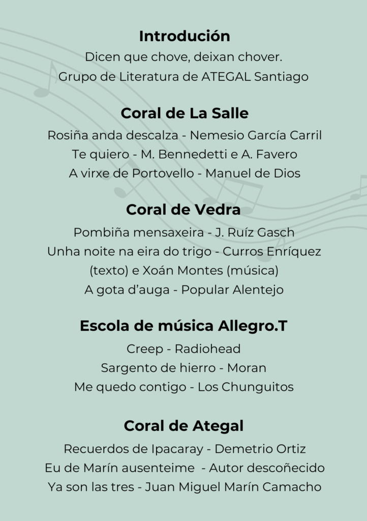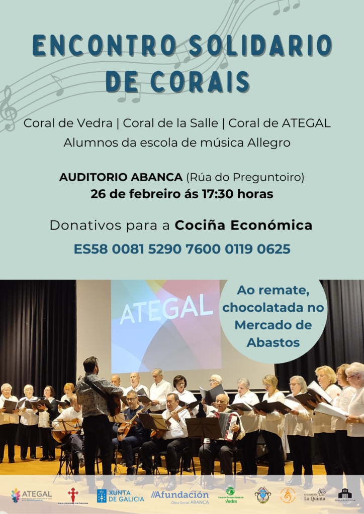 El 26 de febrero, Ategal reúne así a varias corales para ofrecer a los compostelanos una jornada de música a cappella. Los asistentes al evento, que se celebrará en el Auditorio de Afundación a partir de las 17:30, podrán disfrutar de las actuaciones de las corales de Vedra y La Salle, de los alumnos de la escuela de música Allegro T. y de la coral y el grupo de literatura de las Aulas Senior de Santiago.