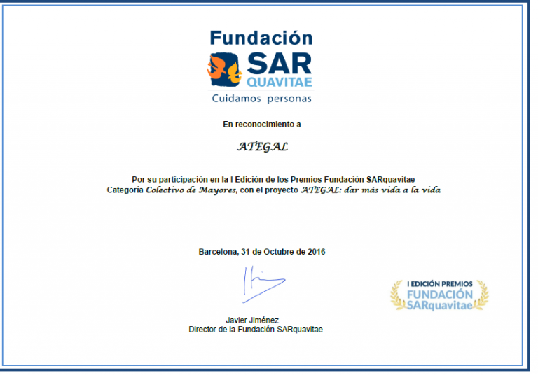 ATEGAL ha participado en la I Edición de los premios Fundación SARquavitae... La Fundación nos ha dicho que : "Todas y cada una de las candidaturas -rebosantes de emociones, solidaridad, entusiasmo, generosidad, respeto y aprecio a nuestros mayores- son la prueba manifiesta de los valores que queremos y debemos compartir. ¡Gracias!" Ahora a esperar el veredicto