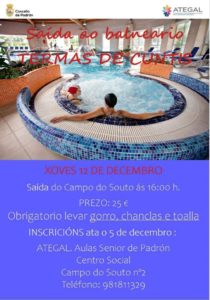 Diciembre es el mes perfecto para relajarse en un balneario y las Aulas Senior de Galicia lo sabemos muy bien. Por eso desde el Ayuntamiento y las Aulas de Padrón se organiza una excursión al balneario Termas de Cuntis para el martes 12 de diciembre. La salida será desde Campo do Souto a las 16:00h.