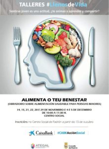 Las Aulas de Padrón continúan con el taller Alimenta tu bienestar, donde los participantes podrán aprender hábitos para una alimentación saludable y equilibrada. Las sesiones se llevan a cabo los jueves y viernes de noviembre y el 4 y 5 de diciembre. Enmarcado en el programa Llenos de Vida de la Acción Social de Caixabank,
