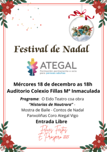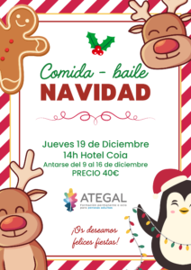 El jueves 19 de diciembre, Ategal Vigo celebra la comida.baile de Navidad. Los asistentes deberán inscribirse previamente, entre el 9 y el 16 de diciembre, en la sede de las Aulas. La comida se celebrará en el Hotel Coia a las 14:00h y tiene un precio de 40€.