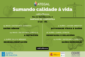 «Sumando calidade á vida», leste é o título do novo taller que acollerán as Aulas Sénior de Santiago de Compostela. Aínda que, nesta ocasión, levámolas ás rúas da cidade. O caféLaMorena acolle estas xornadas sobre saúde, que se ofrecen a todo o público compostelán de maneira gratuíta. Un encontro temático en cada dunha estas datas,