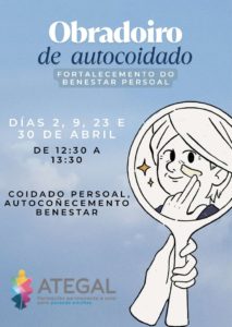 En abril, las Aulas de Santiago tienen preparado un taller de fortalecimiento del bienestar personal. En él, los asistentes trabajarán el autoconocimiento y el cuidado personal para conseguir maximizar su bienestar. Las sesiones se llevarán a cabo los días 2, 9, 23 y 30 de abril. En la sede de Ategal Santiago de 12:30 a