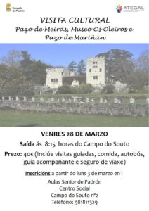 El viernes, 28 de marzo, las Aulas de Padrón se van de excursión. En la jornada, visitarán el Pazo de Meirás, el museo Os Oleiros y el Pazo de Mariñán. Las iscripciones se llevarán a cabo a partir del 3 de marzo en Ategal Padrón. El precio es de 40€ e incluye visitas guiadas y