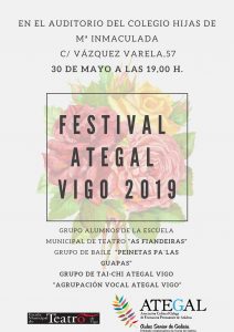 Las aulas de Ategal Vigo, junto con la Escola Municipal de Teatro celebran un festival por la proximidad de fin de curso con un programa con varias actuaciones. El festival se celebra el jueves 30 de mayo a las 19.00 horas en el Auditorio del Colegio Hijas de María Inmaculada (c/Vázquez Varela, 57) y en