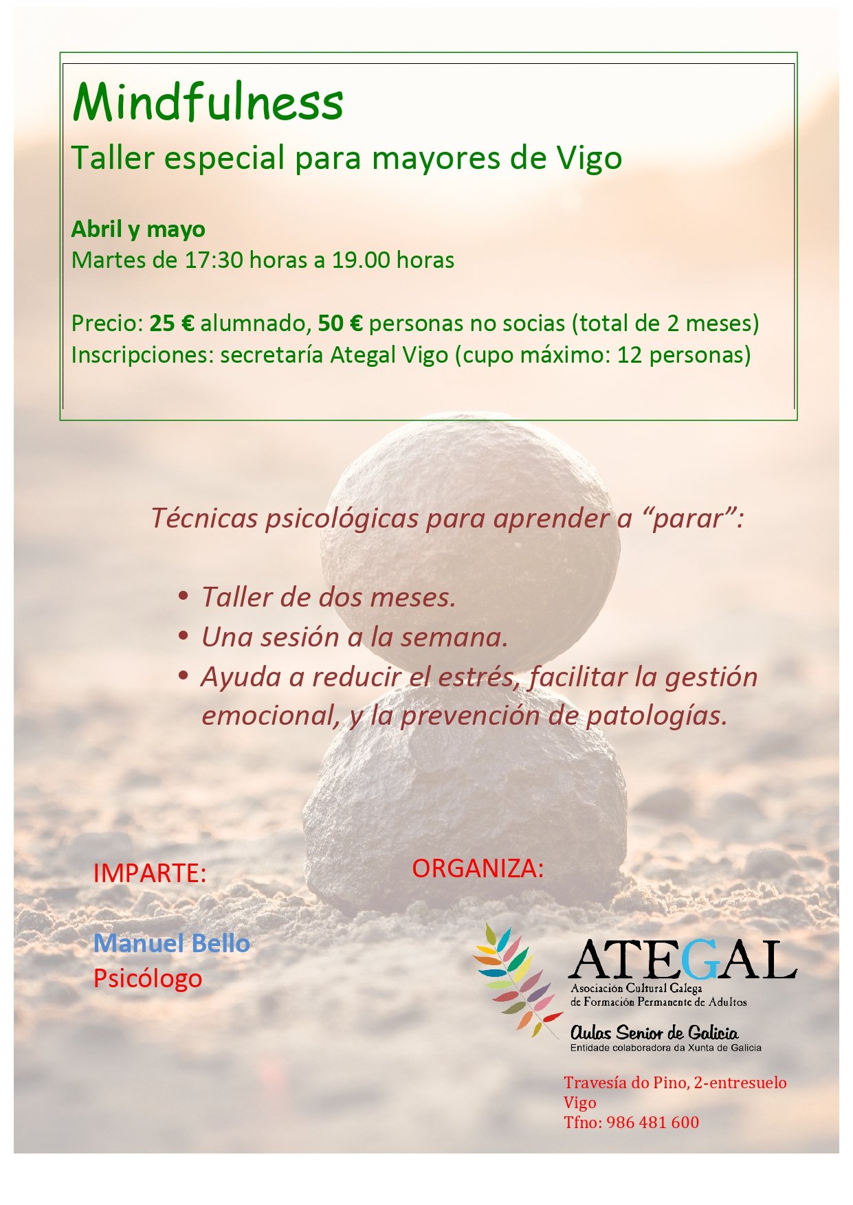 Las sesiones se celebran los martes de abril y mayo entre las 17.30 horas y las 19.00 horas en la sede de Ategal Vigo (Travesía do Pino, 2-entrechan).