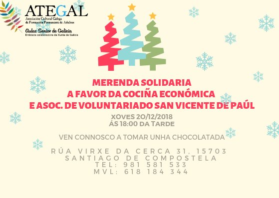 As Aulas Senior de Galicia (Ategal) invitan ao seu alumnado e a toda á cidadanía a un ‘chocolate con churros’ o xoves 20 de decembro a partires das 18.00 horas na súa sede de Santiago (rúa Virxe da Cerca, 31).