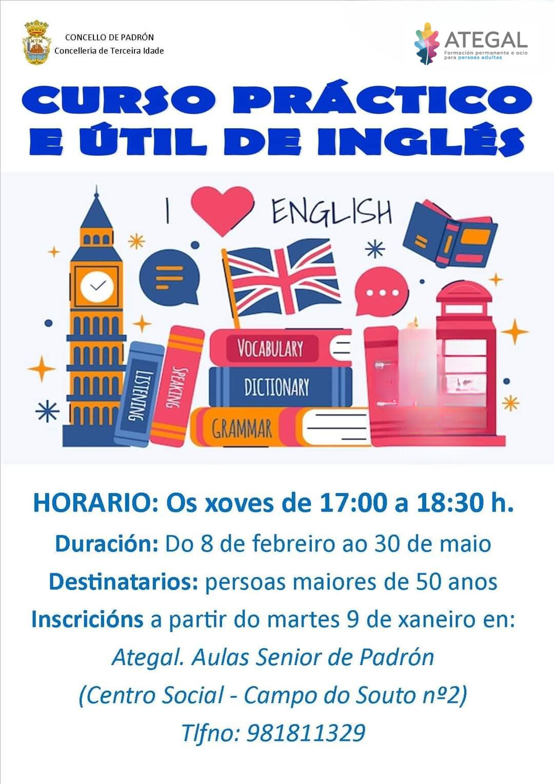 Las Aulas de Padrón dan inicio a un nuevo curso de inglés el próximo jueves, 8 de febrero. El curso se impartirá en el centro social de Padrón todos los jueves de 17:00 a 18:30 horas durante los próximos 4 meses, finalizando el 30 de mayo.