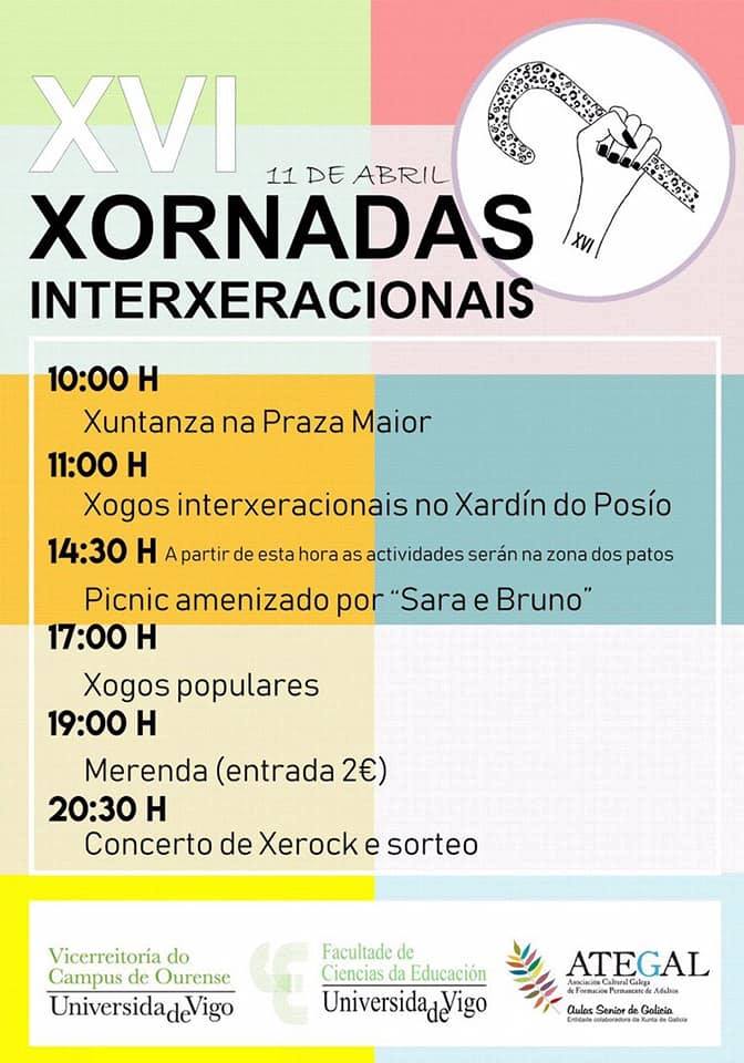 (Víctor Sariego, 2/4/2019).- As Aulas Senior de Galicia en Ourense, Ategal, e maís o Campus de Ourense da Universidade de Vigo (Uvigo) celebran o 11 de abril as XVI Xornadas Interxeneracionais cun amplo programa que se pecha, na tarde noite, co concerto do grupo Xerock e un sorteo para todas as personas participantes nas xornadas.
