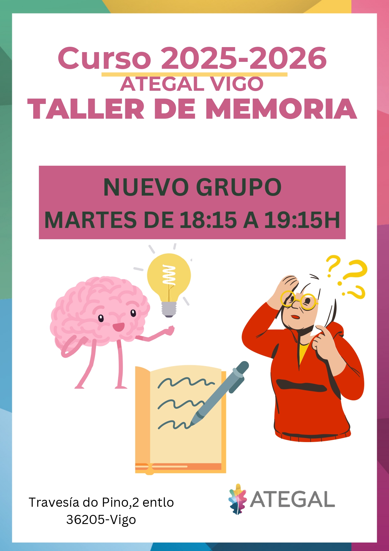 Ante el éxito del taller de memoria, las Aulas de Vigo abren un nuevo grupo para los martes de 18:15 a 19:15 horas. Iniciarán las sesiones el 14 de octubre. Las plazas son limitadas y los interesados ya se pueden inscribir: Por teléfono: 986481600 // 634910119 Por correo electrónico: vigo@ategal.com |